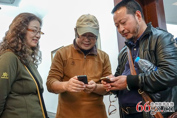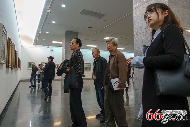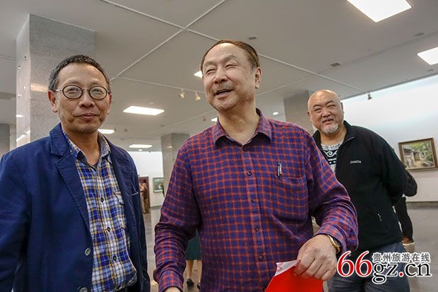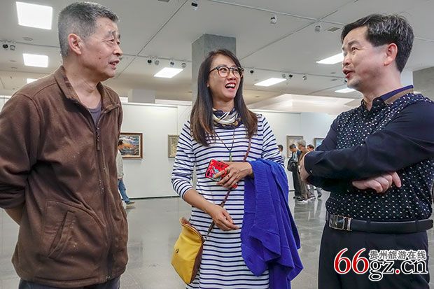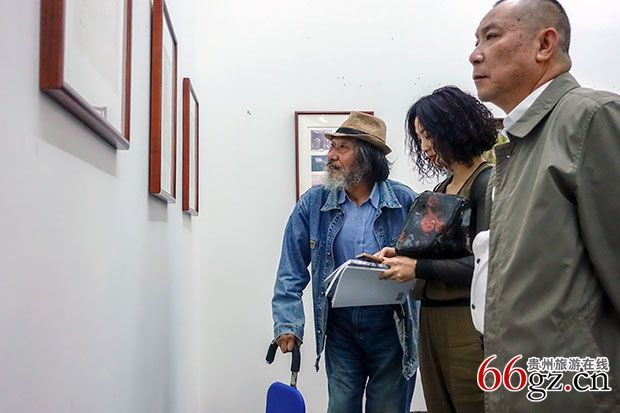 贵州师大美术学院教授郭达平(中)携夫人前来观展