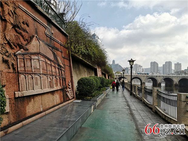 时而浏览这美丽的湖光景致,时而用一份宁静去解读那两岸墙壁上用原石雕刻的贵州土色土香的诗画……