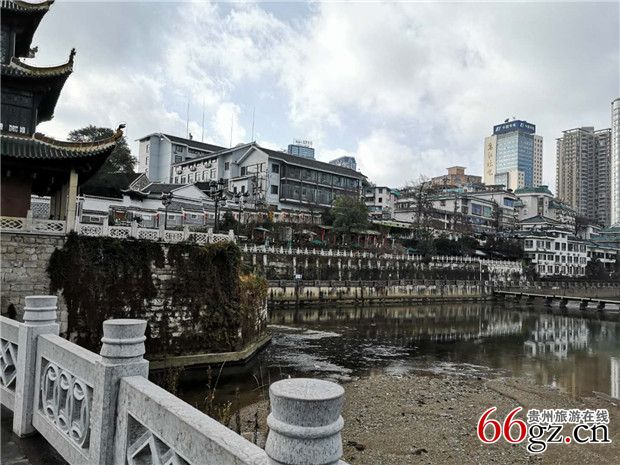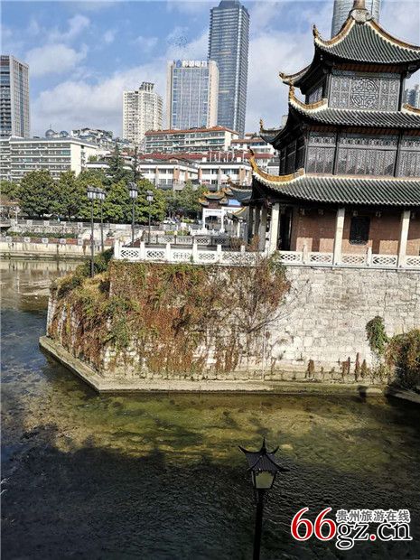 金波绿水,尽收眼底,甲秀楼与高楼大厦时隐时现,古树环绕,清幽妖娆,亭台楼榭,依水而立……