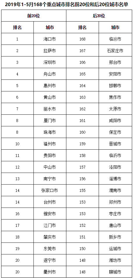1-5月,在168个重点城市中,临汾、石家庄、邢台、安阳、邯郸、焦作、太原、咸阳、保定、晋城等城市空气质量相对较差。海口、拉萨、深圳、舟山、惠州、黄山、丽水、厦门、珠海、福州等城市空气质量相对较好,其中贵阳市排名全国第11位。