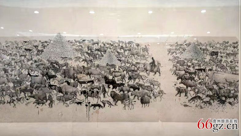 让人印象深刻的是,唐满文始终用一种童真、童趣的眼光来体验、感受和描绘这个世界。在他的“海国图誌”作品中,他从容不迫地把海底动物一个个、小小的、互不遮避、各自为阵地放满画面,丰富生动且毫无“违和感”;这样的传达方式我们在六年后的今天再一次在他的新作中看到了。题为“备忘录之彼岸计划”的作品仍然与动物有关,不同的是这些陆上动物已经互有关联了:一叶似乎是纸折叠的方舟上,聚合着一支超大的动物队伍,在“真实”的动物中混进了人类艺术家创造的动物形象,如韩泥、毕加索笔下的牛、解剖图里的牛者在自己坚持的,儿童似的纯朴、纯粹和单纯的观看方式与表述方式中坚守了精神述求的至真至纯;发现了一个重大的主题即生态恶化趋势下对地球生命(包括人类及其艺术)生存方式的变化和未来发展方向的忧虑,传达了作者深刻的远思。在铜版画技法上,他多年的执着使自己找到了更为细微和精准的、合自己的方法与手和谐与强烈的感染段,使作品在不显山、不露水中达到高度,其实是为作品而的艺术实践再次说明,所谓“技术,是为作品而“生”而“””变,就是作品精神观……