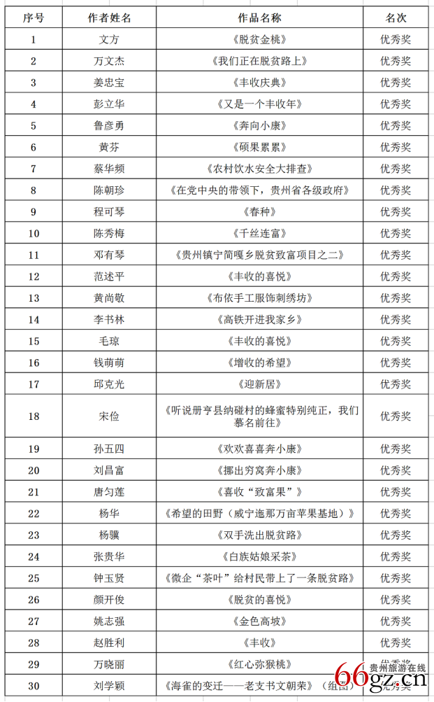 活动截止到2020年9月13日,贵州省文化馆共征集八百余份作品。来自五湖四海的摄影家将作品汇集一起,展开了一场有关脱贫攻坚的文化交流盛宴!通过网友的投票助力,最终共有177幅摄影作品脱颖而出!其中包括人气奖3名,一等奖3名,二等奖6名,三等奖10名,优秀奖30名,入选参与奖125名。近日,所有入选名单以及获奖作品名单已通过活动官方平台“贵州数字文化馆”和“多彩贵州文化云”平台进行线上展示。