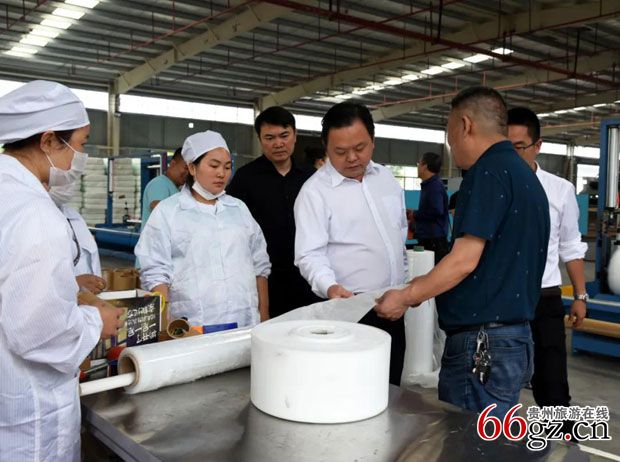 松桃苗族自治县县委书记李俊宏(右三)到熔喷布项目调研。松桃县投资促进局 供稿