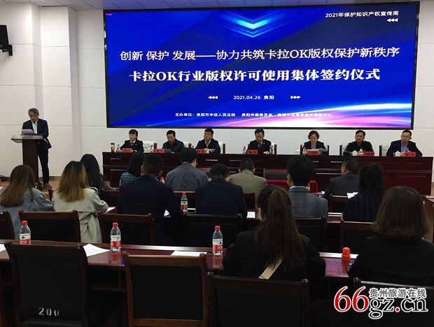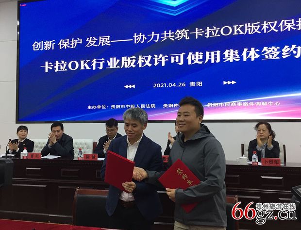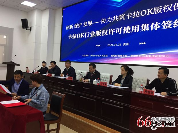 知识产权保护日活动由市中院联合贵阳仲裁委员会、贵阳市民商事案件调解中心共同举办,市委宣传部、市司法局、市文化市场综合执法支队、市文化和旅游局、贵州版权登记中心等单位参加;中国音像著作权集体管理协会副总干事马继超、贵阳文化娱乐行业协会会长蔡君分别致辞;在现场,中国音像著作权集体管理协会与贵阳市文化娱乐行业协会签署了《加强知识产权保护,建立卡拉OK著作权集体管理新机制合作协议》,与贵阳市KTV 场所代表签署《著作权许可协议》。