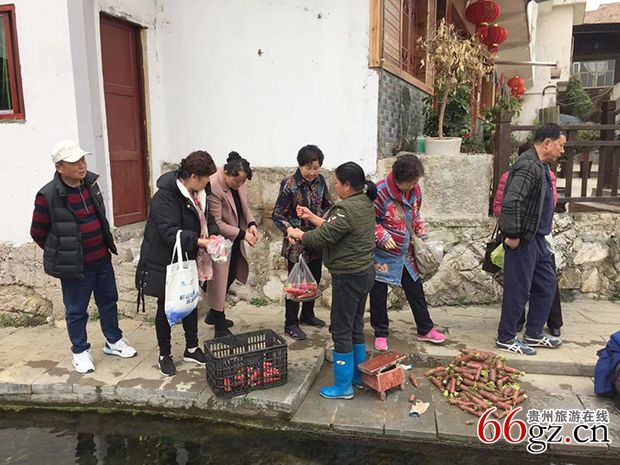 我们参观了龙井屯脚院、新建的民居楼房、土陶作坊、蜡染扎染体验馆等。在贵阳市文物保护单位青岩龙井寨龙井了解到古井的传说,看到几十年前贵阳市南明河曾有的景象:坐在河水边的洗衣人用木棒槌衣服。有位妇女在清洗刚出土的红萝卜,大家涌向前去争相购买,甚至立即入口品尝。来到龙井集市更是一通扫荡:各种新鲜蔬菜、干菜、腌菜、花生葵花,无所不买。是谁喊着“要留点钱到青岩古镇买猪脚啊!”大家才提着大包、背着小袋离开。
