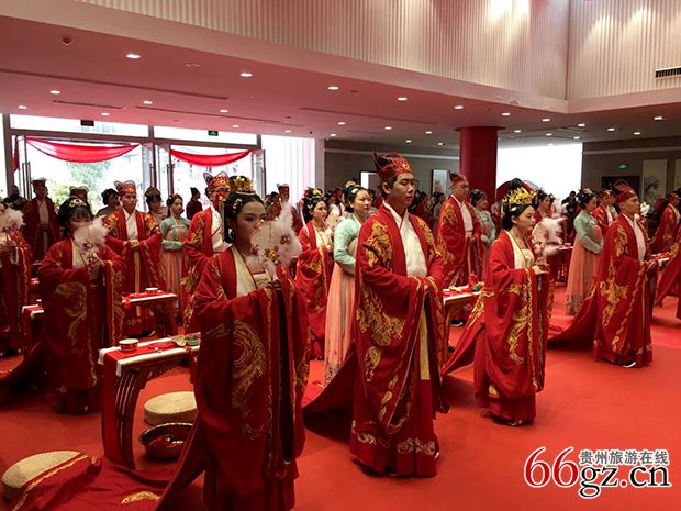 10点30分,贵阳市政府、贵州省妇联、贵阳市委宣传部、市妇联等相关领导及贵州民族大学的嘉宾莅临现场,20对在去年至今年登记结婚的新郎新娘身着唐朝婚纱礼服,在同样穿着唐朝礼服的伴娘陪护下徐徐入场,以“中华婚礼文化特色+婚事新办时尚元素”为主题集体婚礼正式开始。领导和嘉宾向新郎新娘表示热烈祝贺,为新人代表赠送了《习近平关于注重家庭家教家风建设论述摘编》等书籍,发出了“贵阳市弘扬时代新风 倡导婚事新办倡议书”。
