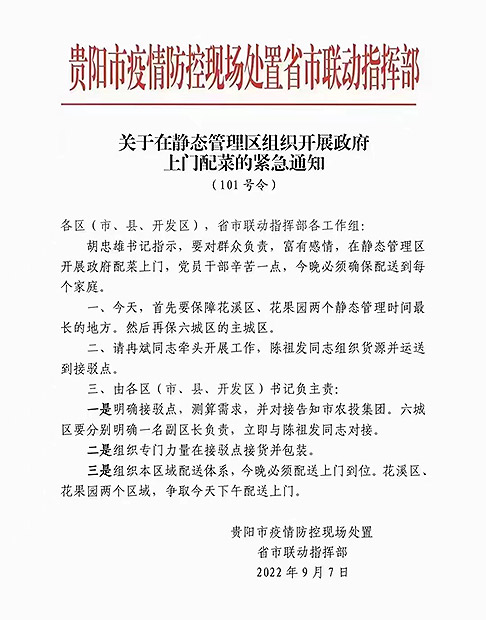 为落实“早发现、早报告、早隔离、早治疗”要求,快速阻断疫情传播链条,自9月2日零时起,坚决果断对花溪区采取静态管理,并根据疫情发展形势,逐步扩大范围,目前已全域实施静态管理。把全员核酸筛查和物资供应保障,作为当前工作的重中之重,继续扩大和加强全员核酸检测和抗原筛查。物资供应是防疫基础,6日以来指挥部连发7道指令,进一步优化供应保障方案,确保物资保供车辆进出不卡、保障物资供应充足、储备充裕;进一步优化供应配送环节,健全配送体系,充实配送人员,优先核酸检测,全力保障货行不堵、货有人送、居有所用。但近期因转运能力受限,出现下单难、投运慢等群众反映的问题,正在全力调度改进。