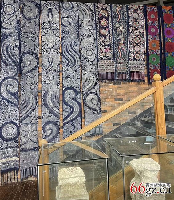 馆内58米长的真丝蜡染由榕江塔实乡李茂兰、杨妹两位传承人于2012年耗时半年在当时省博物馆完成。画中百龙百鸟精彩纷呈,是现今世界上最长的真丝蜡染。