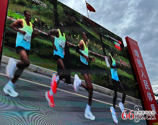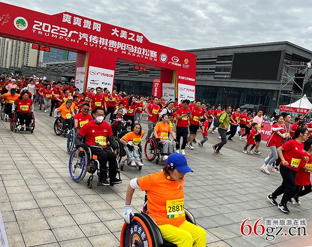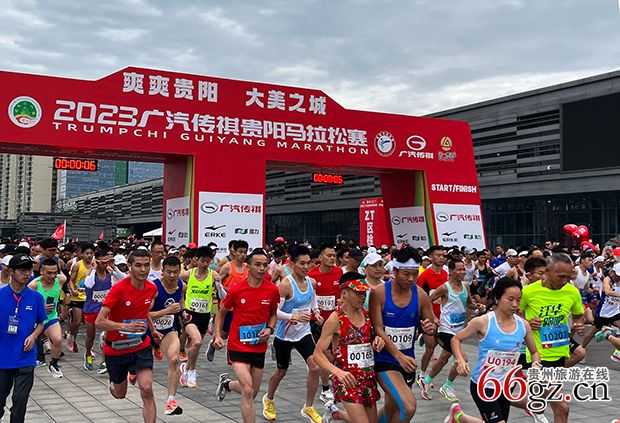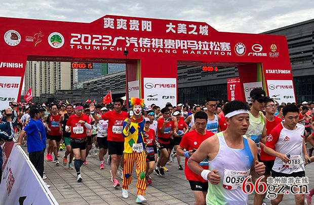 在北广场,随着鸣枪台上的出发令,参赛队伍前面的参赛者如离弦之箭冲出起跑线。来自32个国家和地区、全国34个省、自治区、直辖市及港澳地区的25,000名选手(其中马拉松5000人,半程马拉松、迷你马拉松各10000人),潮水般奔腾而出,将起跑线后面的红色海洋变成赛道上的红色河流,后浪推着前浪奔涌向前。参赛者奔跑着、欢呼着、舞动着国旗,张张笑脸洋溢着我健康、我参与、我快乐的骄傲与自豪,参观者不停高喊加油!加油!解说员声情并茂、声调也越来越高。大家群情激奋,人人热血沸腾,仅仅是25000人起跑就持续近半小时;观山湖区、白云区、高新区的赛道沿线,挤满了参观者、啦啦队,还有展演点的展演活动,齐心协力为参赛者们鼓劲助威,跑者雄风、生态环境、美丽风景、缤纷人景融为一体,构成一幅人与自然和谐的动人画卷。