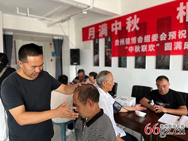 当天在现场推出多个服务项目,品茗室里,茶美小组早已备好各种茶品,组长、国家一级评茶师赵新旗老总亲自坐镇,分享“茶与生活”讲座;健康理疗区,中医养生组特邀宋康医院院长宋汉志和著名中医陈医生,为患者摸脉问诊开药方。贵州宏洋润天公司的罗、胡医生为患者推拿、按摩,还带来治疗仪为颈肩腰腿痛者精心治疗。贵阳苗医苗药研究院执行院长、扁鹊传人杨成凯,是“传统中医养生文化大讲堂”进社区公益活动的总策划和首席讲师,向大家传授中医养生保健知识;热火朝天的厨房里,更是忙得不亦乐乎,包饺子、做胡辣汤、切西瓜,厨师和志愿者挥汗如雨,为老乡们准备丰盛的家宴。而爱书人和孩子们乐享的图书室,则完全是另一种静谧安详景象。