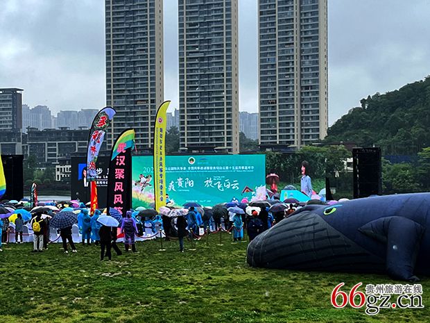 5月17日上午,贵阳市普降大雨,贵阳白云国际风筝会全国风筝邀请赛暨贵阳白云第十五届风筝嘉年华(简称风筝会),如期在白云区泉湖公园举行,贵阳市各级相关领导、省内外游客和广大市民群众冒雨参加。