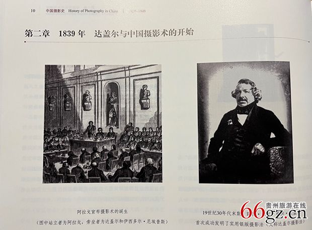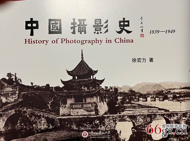 《中国摄影史》封面与《贵州摄影史》一样,为法国摄影家白斯德望于1852年拍摄的贵阳甲秀楼。内容除序、自序、前言,有内文3卷,各16、1、3章,另列参考文献、图片来源、5项附录,其中一部分为中英文。