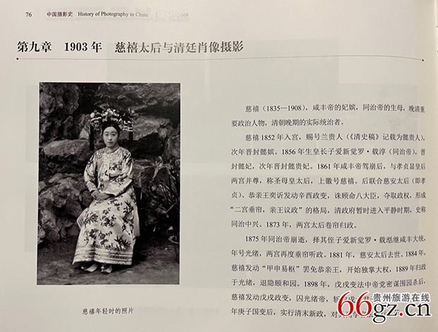 前16章,从中国古代的光学成就、《墨经》与光学八条(公元前476—420年),及1839年法国美术家、化学家达盖尔与中国摄影术开始,以清代物理学家邹伯奇制造中国第一台照相机,白斯德望将摄影术引入中国,赫尔曼·哈斯本德、李阁朗、罗元祐在上海开设照相馆,费利斯·比托拍摄的中国老照片,日本鸟居龙藏的中国人类学调查摄影,法国驻广西龙州领事方苏雅带7部相机拍摄的大量照片等,到慈禧太后与清廷肖像摄影……还有1847年白斯德望拍摄的黄果树瀑布,直至1943年约翰·阿尔贝特拍摄的第一幅贵州“二十四道拐”照片,近2000幅历史图片,均辅以详细、具体、准确的文字说明。