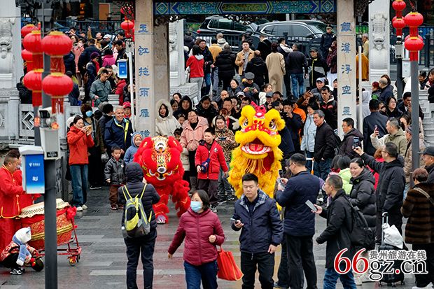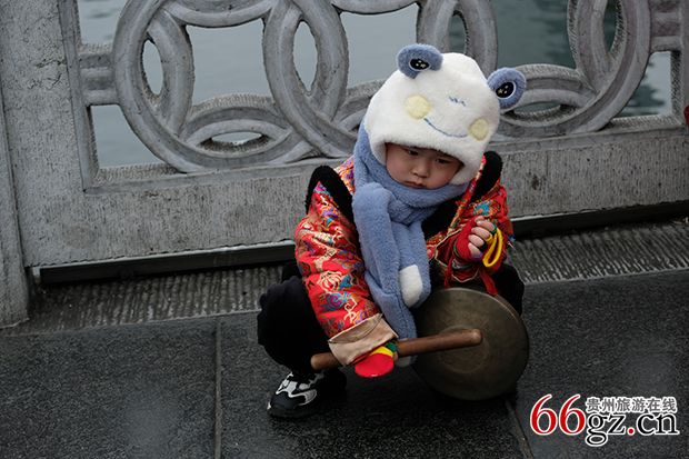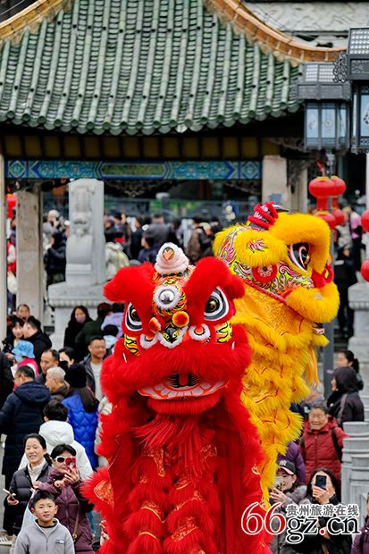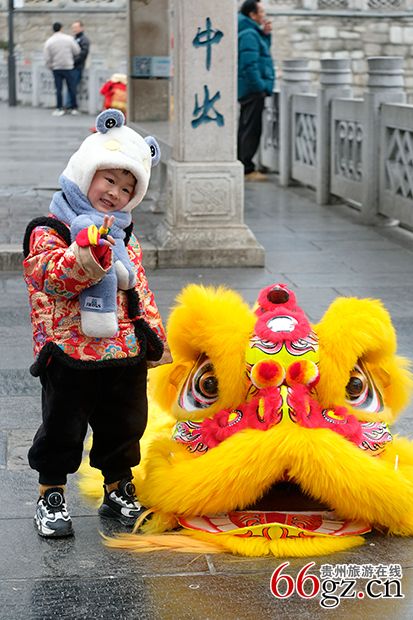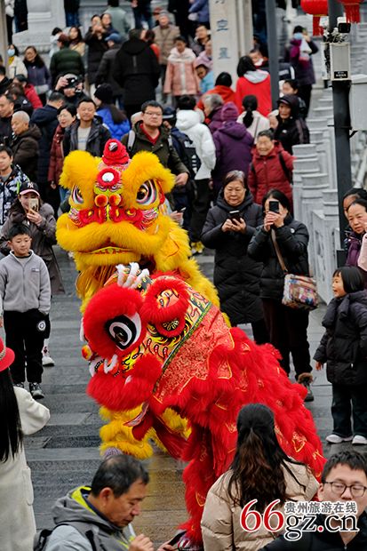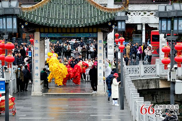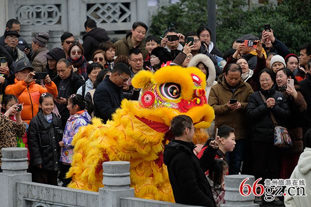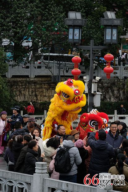 今天是春节假期的最后一天,甲秀楼前的浮玉桥上,人头攒动,一红一黄两头狮子从牌坊下沿浮玉桥一路起舞,踩着鼓点,忽仰忽卧,忽左忽右,蹦蹦跳跳,眼睛忽闪忽闪,好生可人!