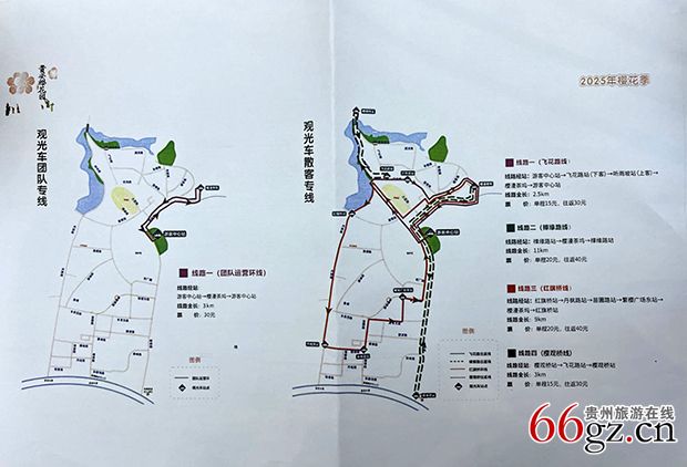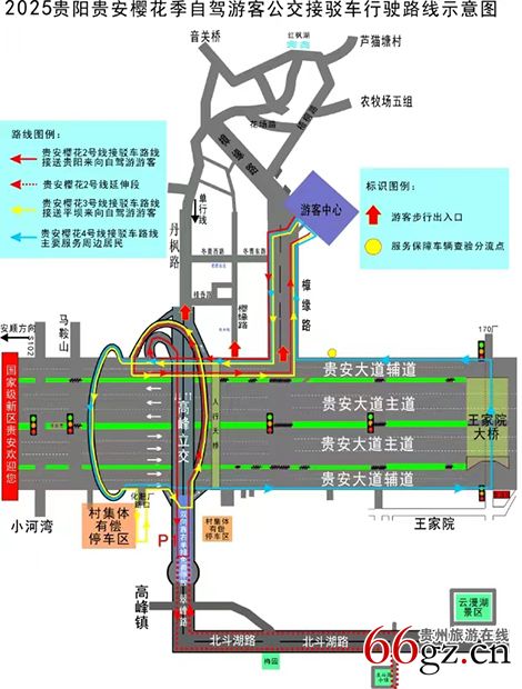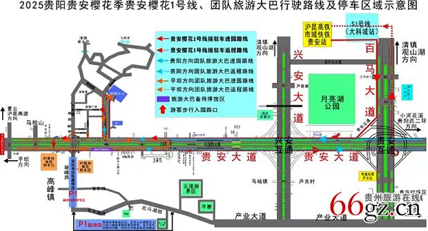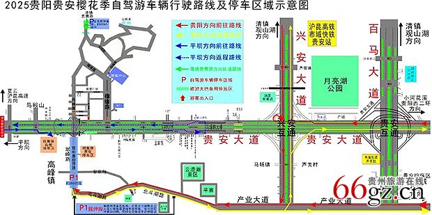 交通组织方面,确保游客安全、有序、畅通。一是根据花期时间交警部门将对贵安大道(马鞍山至马场特大桥双向)、翠峰路(原高峰大道)、樟缘路进行交通管制,赏樱游客均通过公交接驳车或团队旅游大巴进出园区,确保贵安大道主道交通畅通;二是在贵安新区翠峰路(原高峰大道)设置临时停车区,自驾游客可在翠峰路双向靠右侧单排免费停放车辆,全段可提供约2000个小型车辆停车位,翠峰路停车饱和时,延伸至北斗湖路停放。同时翠峰路周边村集体及农户家中可有偿停放部分车辆,但容量有限,市民停车后再选择步行或乘坐公交接驳车进入园区赏花;三是为贵阳、清镇、平坝主要方向的自驾游客制定3条自驾赏樱路线,按照推荐路线驾车前往指定停车区后,再选择步行或乘坐公交接驳车进入园区赏花,公交接驳车惠民票价2元/人;四是提倡大家错峰出行,首选公共交通。请密切关注贵安交警微信公众号、微博和贵州交通广播电台、贵阳交通广播电台等,如遇樱花园人流车流饱和,交警部门将及时发布路况及管控等信息。