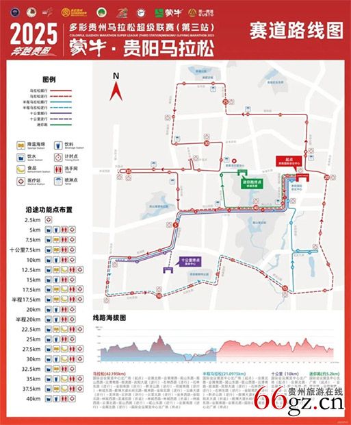 其中马拉松(42.195km)路线为:国际会议展览中心北广场(起点)—会展北路—会展南路—观山东路—观山西路—云潭南路—观清路—宾阳大道(逆行)—石林西路(逆行)—石林东路(逆行)—金阳南路(逆行)—黔灵山路(逆行)—同城南路(逆行)—林城东路—数博大道长岭北路—枫林路—金阳北路(逆行)—云峰大道(逆行)—龙井路—云环路(逆行)—云潭北路(逆行)—金朱西路—金阳北路—林城西路—龙滩坝路(折返)—林城西路—林城西路(折返)—林城西路—云潭北路—观山西路(逆行)—观山东路(逆行)—会展南路(逆行)—会展北路(逆行)—国际会议展览中心北广场(终点)。