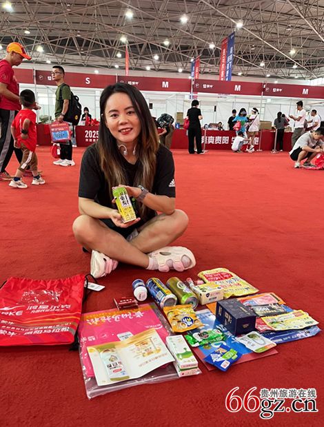 在现场,从北京来的健美跑者“大王”正在清理参赛包,参赛物质丰富多样。她兴奋地说:“6月14日是我生日,每年都会找些有趣的过法,前两年是登雪山,今年贵阳马拉松刚好是我生日的这个周末,便决定来亲身感受一下。” 她于2015年第一次跑马拉松,现已完成世界六大满贯,可谓资深跑者,虽然成绩并不优秀,但充分享受到跑步的快乐和成就感。对于上班族来说,也是结识新朋友的机会,通过跑步认识一个全新世界。