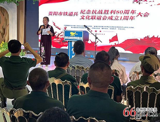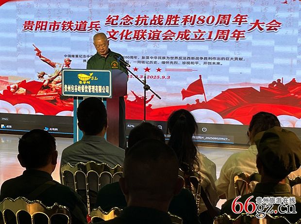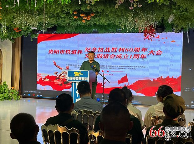 贵州省铁道兵文化联谊会秘书长余朝怀、会长葛锦楼致辞,他们深情回顾八十年前在黔南事变中独山军民的血战,用生命守护的抗战运输线史迪威公路——始为铁道兵精神的源头。1948年东北野战军铁道纵队成立后,这支队伍一直传承抗战中“人在桥在,人亡桥修”的忘我精神。贵州铁道兵在战争年代舍生忘死、前赴后继,确保大量军用物资和兵力及时输送,为抗战胜利建立了不可磨灭的历史功勋。在祖国建设时期更是一支强大的突击队,发扬“逢山凿路、遇水架桥”的铁道兵精神,为祖国铁路建设做出了重要贡献。纪念抗战胜利80周年,就是要以史为鉴、开启新征程,铭记历史、开创未来,在新时代继续铺就民族复兴的钢铁大道。