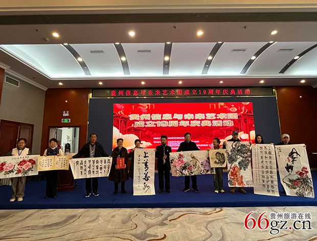 在现场,艺术团以欢快优美的“迎宾曲”暖场节目拉开了庆典序幕;贵州省未来学会领导张继泽先生在致辞中深情回顾艺术团成立19年来走过的辉煌历程,充分肯定艺术团在推动科技与艺术融合方面做出的积极贡献;主办单位代表陈俊先先生致欢迎词并热烈祝贺艺术团取得的喜人成绩,贺宏琼女士围绕“科技与艺术融合”主题,从理论与实践层面阐述了科技赋能艺术创新的重要意义;书画家们将精心创作的象征文化艺术与科技创新相结合的作品赠送协办方,多位嘉宾即席讲话、祝贺。