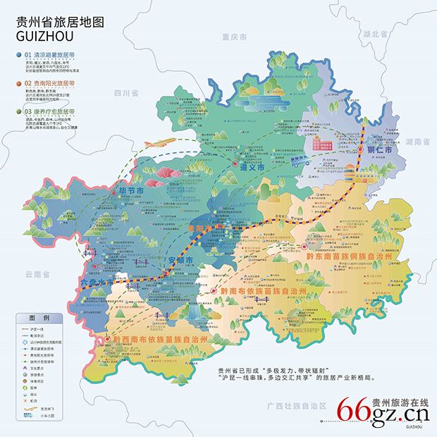 贵州区位交通便利快捷,是西南重要陆路交通枢纽、西部陆海新通道必经地。近年来贵州交通基础设施建设取得显著进展,贵广、成贵、贵南、沪昆等高铁干线贯通,通达长三角、珠三角、京津冀和川渝滇,通车里程达1900公里,实现9个市(州)行政中心所在地高铁全覆盖。高速公路通车里程突破9390公里,在西部率先实现县县通高速。建成1个枢纽机场与10个支线机场,民航机场覆盖全省9个市州,航线网络覆盖全国所有直辖市、省会城市、副省级城市、重要旅游城市等,花江峡谷大桥、霸凌河大桥等为广大旅居客提供了别样体验。贵州综合立体交通网络的日益完善,为旅居客打造出便捷的出行环境,成为旅居产业发展的有力支撑,更为贵州打造高品质旅游目的地奠定了坚实基础。