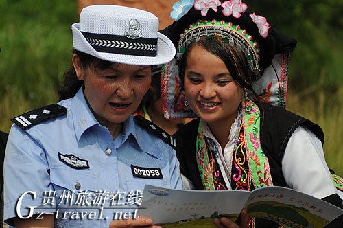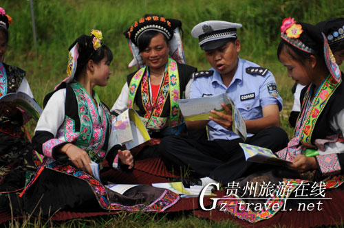 民警在六枝特区陇脚乡月亮河村给布依姑娘讲解交通安全知识
