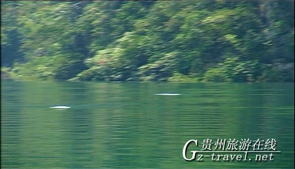 早上九点过游船从中寨乡西嘎村出发,向毛口乡牂牁湖光照大坝水域行驶,记者范云与六盘水市旅游局王述慷、六盘水市建设局总工李雄祥六枝特区旅游局余杰站在船头,当船快行驶到红岩天书景点时,记者突然发现在距离船身40米左右的前右侧方有两道游动的白色“浪花”,一沉一浮的游走,在持续了大约40几秒后消失不见,此时湖面上深渊如碧、平静无波浪,而所拍摄到的水中不明物体呈前行游动状态,排除了浪花的嫌疑,大家估计该不明水生物长约6-8米,根据划水的痕迹,与上次六盘水电视台记者所拍摄到的不明水生物十分相似。