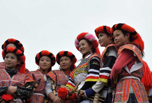 3月7日,六盘水市水城县南开苗族、彝族乡三口塘村苗族同胞欢庆一年一度的“跳花节”。跳花节的高潮为“芦笙叩拜大礼”,芦笙舞者到贵宾面前,摘下英雄帽,单腿下跪,扑地叩拜,之后起身起舞,如此反复三次,以表示向先辈和各方朋友的敬重与谢意。图为盛装出席节日的苗家少女们。