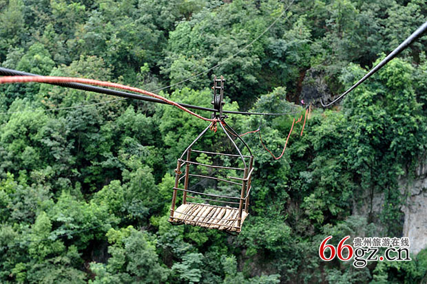 在这里不仅有雄壮的北盘江大桥,还有另外一个吸引众人眼球的“索桥”,这是来到茅草坪不得不去的地方。所谓的索桥就是一根钢丝绳,将绳索两头分别固定在两座山之间,用几根钢筋做了一个四方的框架,搭上几块木板,利用滑轮定律构成的一个简易的交通工具。想要从此桥上顺利通过,需要山的两端都得有人彼此助力拉动滑轮才行。山与山之间都是陡峭的峡谷,其深度可达百来米。