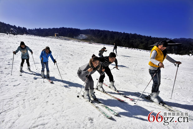 杨昌华介绍说:玉舍森林滑雪场成立于2009年冬季,是贵州省第一个高山滑雪练习场和附属设施。从加拿大双威力国际有限公司引进了人工造雪机、雪地摩托,雪圈等设备,从东北邀请了教练教大家滑雪的技巧,让游客感受到滑雪运动的无穷乐趣。可以花很少的钱,就能领略到北国风光。要是不想滑雪,还可以骑马到林区赏雪、赏梅花、看冰瀑布。累了,可以到滑雪场边喝杯咖啡、热茶,吃点特色小吃。饿了,就美美的吃一顿热腾腾的火锅,在彝族同胞最霸气的劝酒歌中,围着篝火在欢乐的搭踢舞中度过美好的时光。