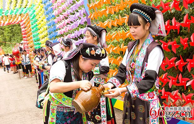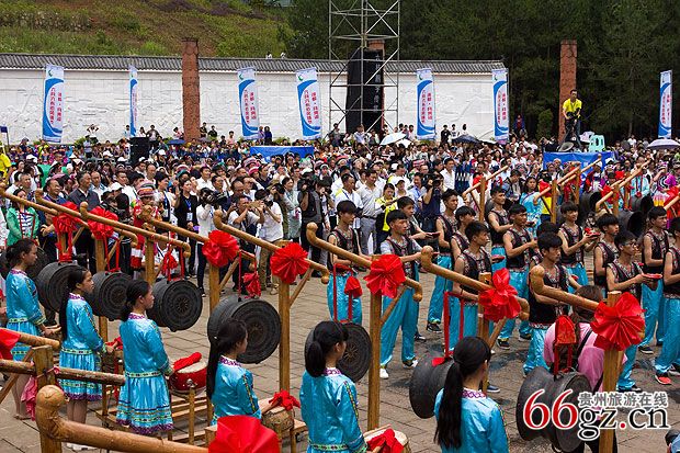 贵州旅游在线讯 鼓声浑厚,歌舞飞扬。充满无限激情的6月,是布依族青年男女激情欢歌的时节。6月29日(农历六月初六),有着“中国布依第一村”之称的六枝特区月亮河彝族布依族苗族乡布依文化生态园铜鼓广场游客如织,六枝特区的布依同胞、周围10多个县和云南、广西的部分布依族群众身着节日盛装,早早从四面八方赶来,与四方游客共度隆重的布依传统节日——“六月六”布依风情节。