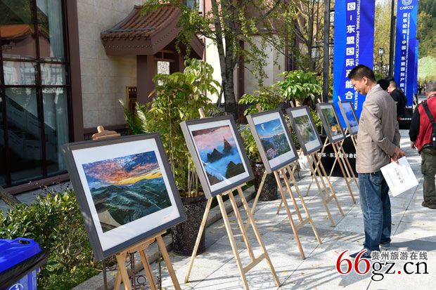 妥乐论坛会议中心右边广场上,东盟10国的国旗顺着五星红旗一字形两边排开,由西向东随风飘扬。会议中心前面,中国凉都旅游风光摄影展100余幅精美的凉都六盘水各景区图片顺着广场边上参差排布,有北盘江大峡谷的壮观、乌蒙大草原的磅礴、梅花山的大气、野玉海的神奇、牂牁江的灵秀,和周围百年、千年古银杏树一起构成了凉都旅游新篇章。