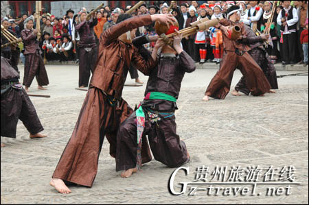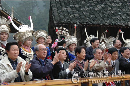 热情的郎德上寨苗族村民吹着芦笙迎接日本客人。在芦笙场上,他们先后为日本客人表演了木鼓舞、铜鼓舞、锦鸡舞等热情奔放,极富特色苗族舞蹈。当一曲用芦笙吹奏的《北国之春》响起来时,日本客人情不自禁地和声歌唱,把场上的气氛推向了高潮。