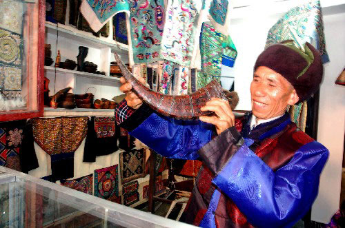 4月7日,一位老人在参观张红宇收藏的牛角。
