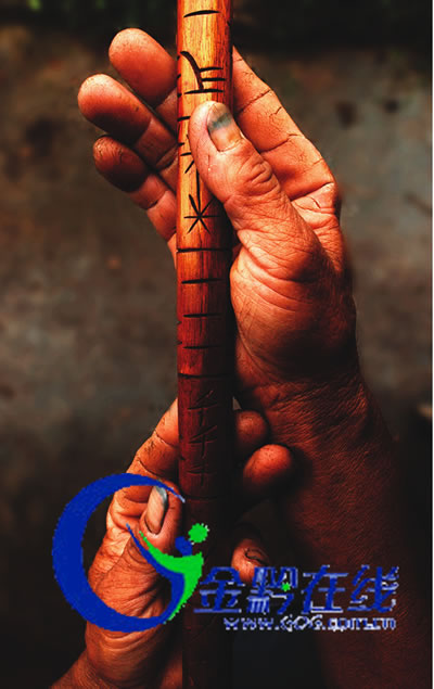 坐在这个农家小院放眼望去,田野被一簇簇青翠的秧苗和明晃晃的水切割成不知几百几千块稻田,从屋檐下一直延伸到天边,间或几个披蓑戴笠的插秧人在忙活。这里就是苗族古歌“刻道”歌师吴治光的家。一个细雨绵绵的夏日,为了寻访传说般神秘的刻道,我们辗转来到施秉县城关镇氵舞阳村。 等了好久,吴治光从田里插秧回来了,腿上还有没有洗尽的泥巴。他解下蓑衣开始生火做饭,忙里偷闲接受采访。他的老伴还在田里干活,上中学的两个孙子孙女马上就要回家吃午饭了。自从儿子和媳妇去广东打工之后,吴治光和老伴的生活就变得更加忙碌。虽然已是60岁的高龄,但是作为留守家里的主要劳动力,犁牛打耙,下田插秧,什么体力活都要干。 在吴治光的记忆里,苗族结亲嫁女都要对唱开亲歌,如果答不出就要被罚酒。年轻时的吴治光因为唱开亲歌而名扬苗山,自从21岁开始唱歌后就没有被罚过酒,常常有对酒当歌三天三夜的记录。那时候四村八寨,谁家有喜事都要请他去对歌。久而久之,吴治光成了远近闻名的歌师。开亲歌牵涉面广,被祖先们以目录的形式刻在一棵笛子大小的木棒上。那些横七竖八的线条,一条就包含了上百行内容,一根歌棒就记载了一万多行的歌词。于是有人把歌棒插在衣襟里,忘词的时候偷偷摸一下就会记起。 随着时间的流逝,苗族的婚姻习俗已经有部分改头换面,请吴治光唱开亲歌的人渐渐少了,年轻人们有电视卡拉ok和麻将娱乐,还要外出打工赚钱养家糊口,没有人对这个不能产生经济效益的刻道感兴趣。吴治光的门庭逐日冷清,刻道曾经给他带来的光环犹如村旁流淌的河水,只在记忆里留下痕迹。只有在夜深人静的时候,他才会用苗语怅然哼上几句:“我们看现在,家家可开亲。男婚女出嫁,老少都高兴……”歌声悠扬婉转,仿佛又回到了当年人声鼎沸的娶媳嫁女场面。 舞阳村偌大的一个村,如今懂得刻道的只有吴治光和他的老伴了。就是整个施秉县,屈指数来,也只剩下寥寥无几的几个歌师,有的村寨已经出现断代的局面。如果不采取措施加以保护,再过20年,刻道将随着这些老人的离世而将淹没在绿水青山里。
