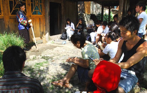 7月4日,贵州省雷山县郎德镇上郎德村53岁的苗族妇女文金花(左)正在为游客当模特。