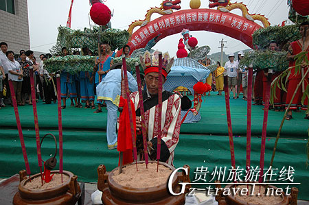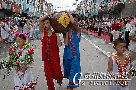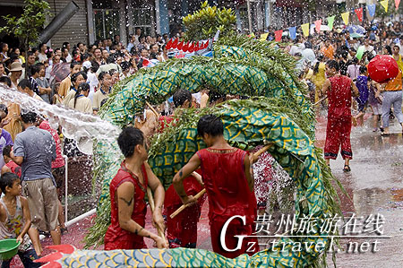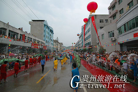 施秉县城玩水龙已有上千年历史。关于“水龙”,在施秉民间有这样一个传说。相传很久以前,有一年久旱无雨,太阳像火一样晒得百花凋谢,五谷不长。人们想尽了各种方法,而老天爷根本没下一滴雨,天下越干越厉害,没有办法的人们只好听天由命了。 一天晚上,一位神仙托梦给一位叫宝公的老人说:“龙、人和狗是亲兄弟,人是老大,龙是老三,狗是老三。兄弟仨长大后,龙分家得到的家产极少,他想不通而负气出走,不想回家。后来,龙成为了掌管风雨的神,可只要一想起分家的事就很生气,于是故意不下雨,让天干使人得不间到好收成。你们如果想得雨,就扎一条水龙,抬上狗,敲锣打鼓上街舞一趟,还要边舞边泼水,一直把龙舞到河边,让龙知道你们心里还有他这个兄弟,这样他就会降雨了。”宝公喜获此言,第二天立即去和寨老们一商量,大家都很赞成扎一条水龙来舞。于是,宝公和寨老便组织各条街道的群众编扎龙,热热闹闹地舞上街,一直舞到河边做完祭祀仪式才回家。果然,龙见到人舞着龙,抬着狗来到河边,想三兄弟又象当初团聚在一起,念及弟兄之情,就呼风唤雨,降下甘霖,解除了人间的旱情。从那以后,每逢五黄六月久旱元雨,群众就择定吉日玩水龙求雨,舞龙的队伍所到之处,街道两侧的居民就用水泼龙,舞龙结束后将水龙投入舞阳河任其自行沉入水中。群众都说泼水龙的水是“吉祥水”,水泼得越多,则表示吉祥如意,兴旺发达,当年就一定会风调雨顺,五谷丰登,国泰民安。如果谁要有幸被泼上吉祥水,就会事业发达,财运兴隆,万事吉祥如意。