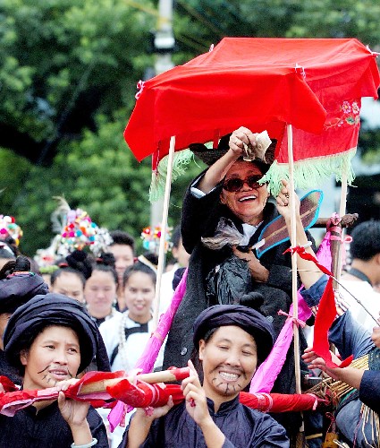当日,一群女扮男装的侗族妇女在玩“抬官人”游戏。