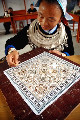 8月28日,一名手工艺人现场展示她绣制的一件民族服装。