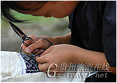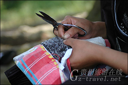 据介绍,苗族锡绣以藏青色棉织布为载体,先用棉纺线在布上按传统图案穿线挑花,然后将金属锡丝条绣缀于图案中,再用黑、红、蓝、绿四色蚕丝线在图案空隙处绣成彩色的花朵。银白色的锡丝绣在藏青色布料上,对比鲜明,明亮耀眼,光泽度好,质感强烈,使布料看上去酷似银质,与银帽、银耳环、银项圈、银锁链、银手镯相配,极其华丽高贵。