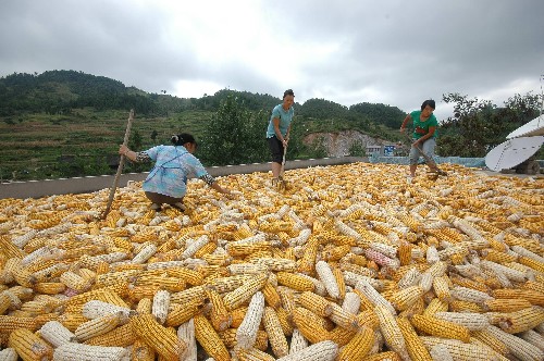 9月2日,贵州省凯里市三棵树镇赏郎村村民在晾晒玉米棒子
