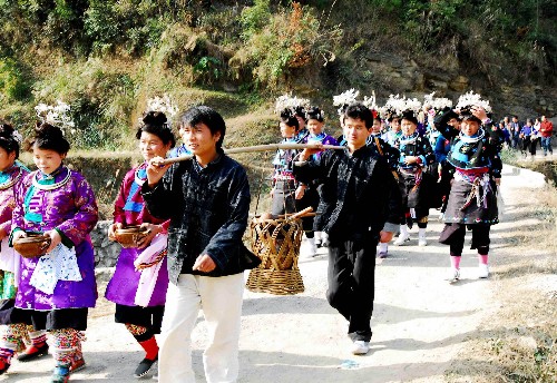 苗族同胞抬着祭品参加祭奠蚩尤活动。