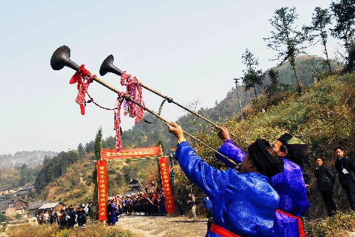 参加祭奠活动的苗族同胞在村口吹响长唢呐。
