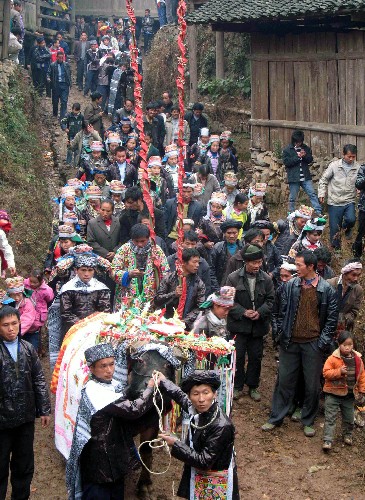 苗族同胞在贵州榕江县三江乡有路村欢庆“牯藏节”。