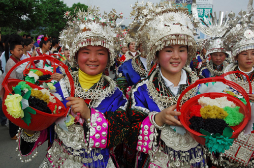 4月19日,身着节日盛装的苗族姑娘提着“姊妹饭”巡游。