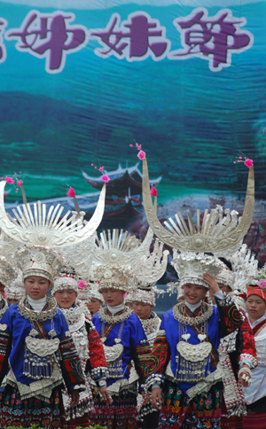 4月19日,苗族姑娘盛装巡游,欢庆姊妹节。