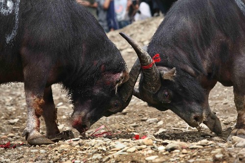 4月20日,在牛王争霸赛上,两头斗牛激烈争斗。