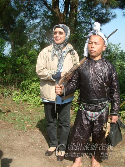 岜沙女孩马来语外籍专家阿蒂亚.宾蒂.穆罕默德.萨勒与岜沙汉子滚月亮留影