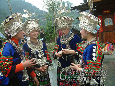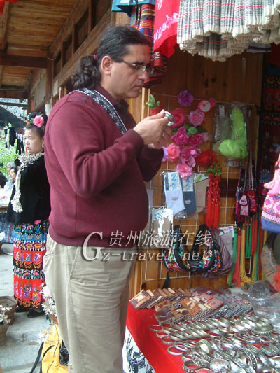 朝鲜语部外籍专家高光树与翻译留影西江千户苗寨土耳其语部外籍专家厄兹江.布泽挑选银饰中