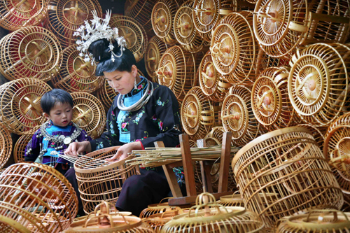 5月5日,在卡拉苗族村,一名苗族妇女在编制鸟笼。