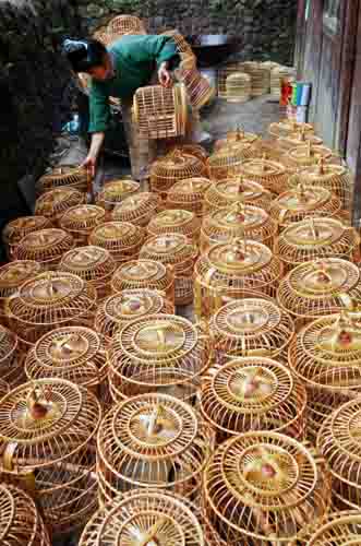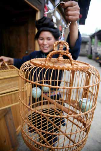 5月5日,在卡拉苗族村,一名苗族妇女晾晒刚上漆的鸟笼。